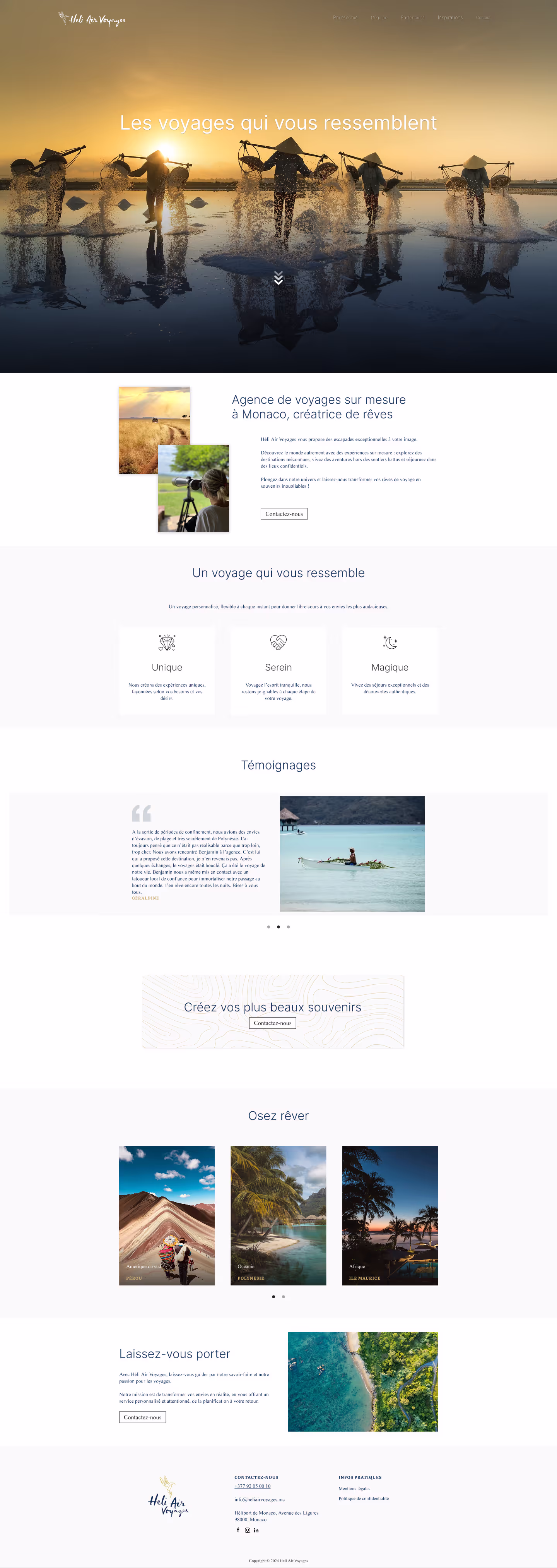 Il s'agit d'un site vitrine de 6 pages (hors pages de sécurité). Le projet a été réalisé pour plonger le visiteur dans l'ADN de Héli Air Voyages, un ADN d'aventure, de découverte et de bienveillance.